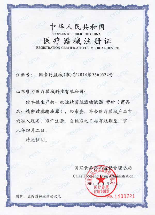 公司獲得一次性使用精密過濾輸液器注冊(cè)證
