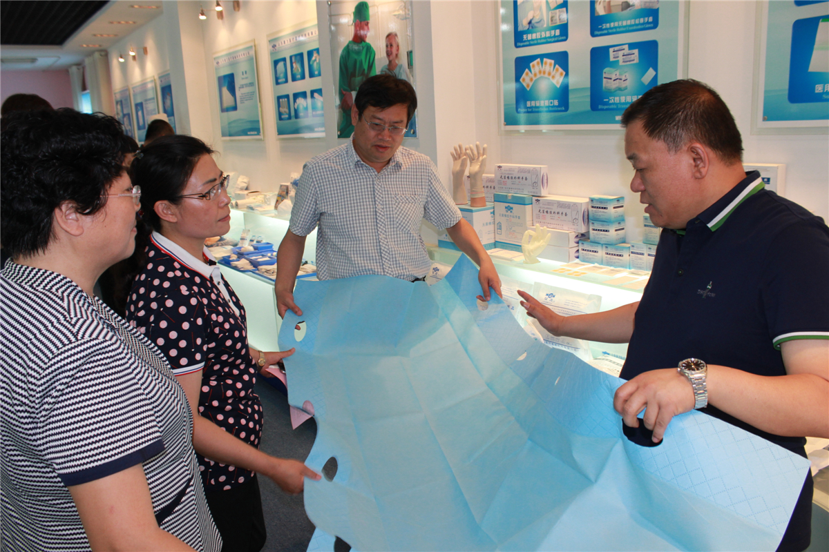 總經(jīng)理向邵局長一行介紹公司專利產(chǎn)品:一次性使用床墊(滑移墊)