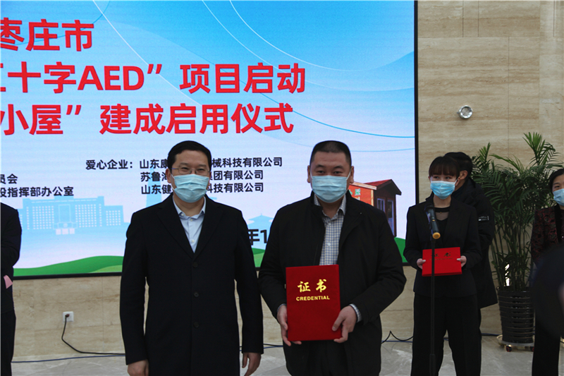 啟動(dòng)儀式上,王凌常務(wù)副會(huì)長代表?xiàng)椙f市紅十字會(huì)向棗莊市健康辦轉(zhuǎn)贈(zèng)了20臺(tái)AED設(shè)備,劉吉忠副市長為愛心捐贈(zèng)企業(yè)頒發(fā)證書,康力醫(yī)療營銷總監(jiān)呂作斌代表公司上臺(tái)領(lǐng)受捐贈(zèng)證書。