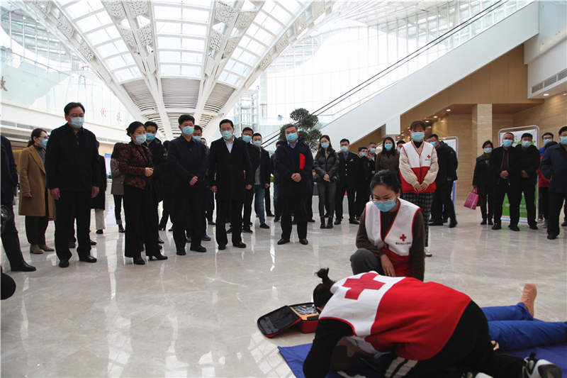 啟動(dòng)儀式后,領(lǐng)導(dǎo)們參觀了棗莊市民中心健康驛站并觀摩了由紅十字志愿者組織開展的心肺復(fù)蘇急救技能培訓(xùn)。