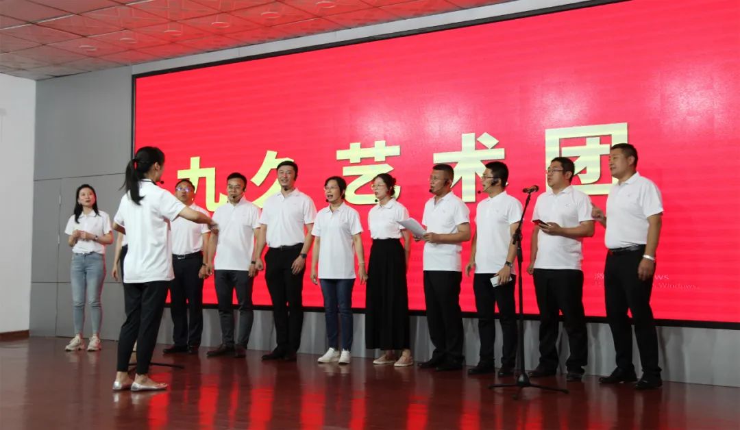 “九久藝術團采用新穎的舞臺劇形式,給大家?guī)砹恕段液臀业淖鎳?、毛主席詞《詠梅》改編歌朗誦、《青春奮斗曲》大合唱等多個節(jié)目。獨唱、對唱、朗誦、合唱……一個個節(jié)目精彩紛呈,現(xiàn)場贏得大家一陣陣的笑聲、掌聲、喝彩聲。
